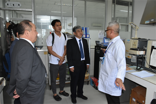 曹春昱一行首先來(lái)到柬埔寨國(guó)家科學(xué)技術(shù)創(chuàng)新實(shí)驗(yàn)室(STINL),參觀水化學(xué)檢測(cè)室、重金屬元素分析室、果汁及啤酒中試車(chē)間等實(shí)驗(yàn)室場(chǎng)所,詳細(xì)了解“一帶一路”聯(lián)合實(shí)驗(yàn)室運(yùn)行情況及此前中方援助設(shè)備使用情況。