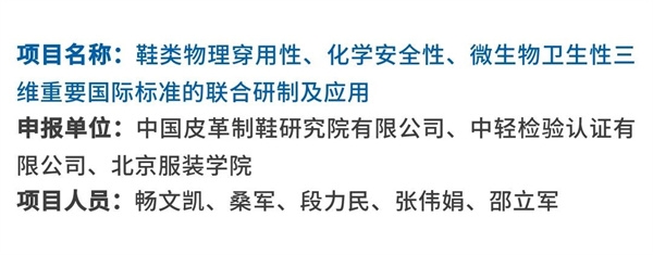 中國皮革制鞋院聯(lián)合申報的“鞋類物理穿用性、化學(xué)安全性、微生物衛(wèi)生性三維重要國際標(biāo)準(zhǔn)的聯(lián)合研制及應(yīng)用”項目,主導(dǎo)制定的國際標(biāo)準(zhǔn)ISO19574、ISO20535和ISO19577,打破多年來歐盟成員國技術(shù)壟斷,實現(xiàn)我國在鞋類微生物、物理和化學(xué)領(lǐng)域國際標(biāo)準(zhǔn)的突破,填補(bǔ)物理和化學(xué)檢測方法標(biāo)準(zhǔn)的國際空白。