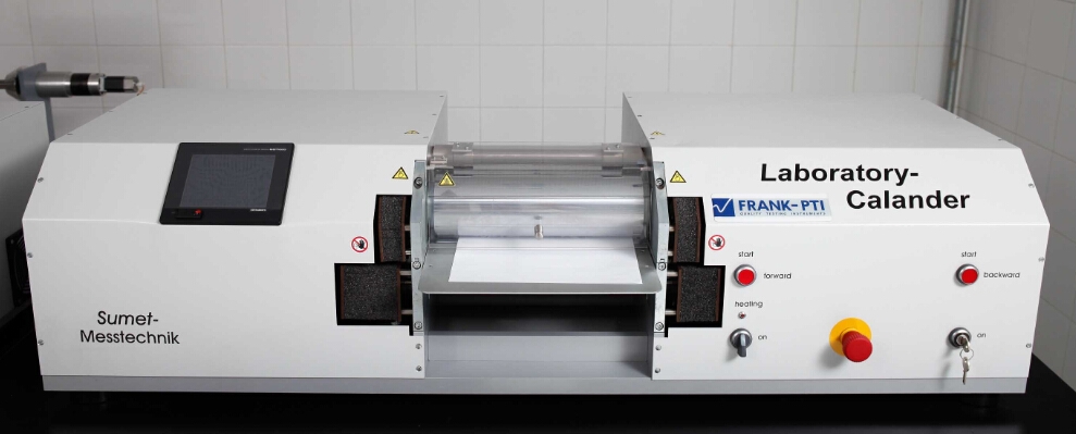 技術(shù)參數(shù):輥寬300mm,輥直徑90mm,頂輥為不銹鋼硬輥和復(fù)合材料軟輥,壓力為0~350N/mm,速度0~25m/min,缸加熱器室溫~160℃。