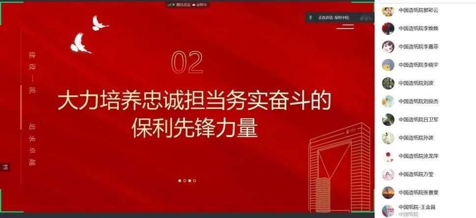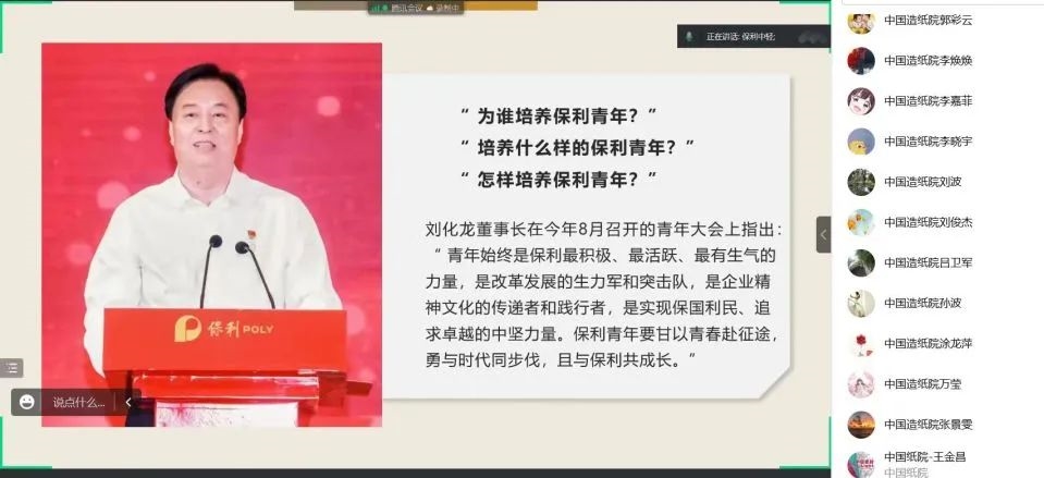 為貫徹落實(shí)黨中央、保利集團(tuán)和保利中輕黨委學(xué)習(xí)宣傳貫徹黨的二十大精神工作部署,促進(jìn)中國(guó)造紙?jiān)簭V大黨員、團(tuán)員深刻理解和準(zhǔn)確把握黨的二十大精神,進(jìn)一步做好青年人才培養(yǎng)工作,12月13日,保利中輕黨委副書(shū)記、總經(jīng)理王珂靈為中國(guó)造紙?jiān)褐v授專(zhuān)題黨課,宣講黨的二十大精神。黨課以線上和線下相結(jié)合的方式進(jìn)行,中國(guó)造紙?jiān)合到y(tǒng)全體黨員和團(tuán)員近200人參加學(xué)習(xí)。